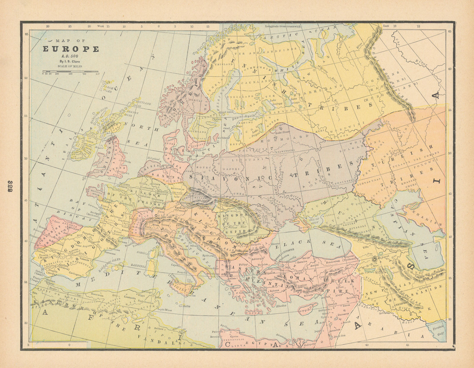 Aggiungere al carrelloMap of Europe, AD 500 by I.S. CLARE 1894 old antique vintage plan chart. Antique colour atlas map; I.S Clare (1894). 27.0 x 34.5cm, 10.5 x 13.5 inches. Condition: Good. There is another map printed on the reverse side.